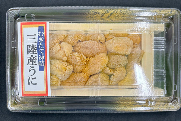 夏場に水揚げした国産うにをむきたてのまま、軽くブランチして急速凍結し、業務用 100g パック、量販店向け木折製品といった規格に商品化します。繁忙期等に国産うにを提供するために最適です。