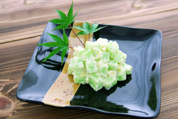 ④ ダイヤサラダわさび味(カラフトししゃも卵を四角く固めて、ピリ辛マヨネーズで和えました。)