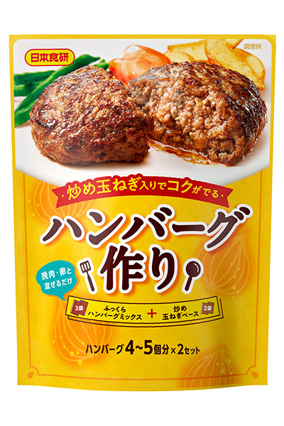 ふっくらハンバーグミックスと炒め玉ねぎベースがセットになっており、材料はひき肉と卵を準備するだけ。材料と混ぜて焼くだけの手軽さです。調味料の分量や味付けのバランスが最適化されており、どなたでも安定した仕上がりに!